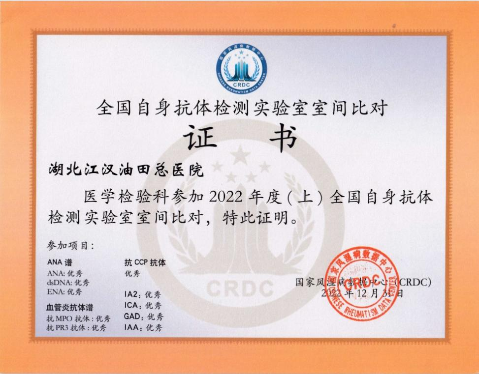 我院检验科在江汉平原较早开设了自身免疫病诊断的实验室,开展了包括抗核抗体谱、类风湿疾病抗体谱、抗磷脂抗体谱、血管炎抗体谱、自身免疫性肝病抗体谱等多项自身抗体检测,基本满足了常见风湿免疫系统疾病的诊疗要求。为加强专业及专科建设,我院检验科从2022年开始主动加入了国家风湿病数据中心(CRDC)大数据库,并参加了由北京协和医院牵头组建的CRDC发起自身抗体检测实验室间比对活动(全国风湿疾病实验室室间评价权威认证平台),为我院临床风湿免疫病的个体化、精准化治疗提供了坚实保障。