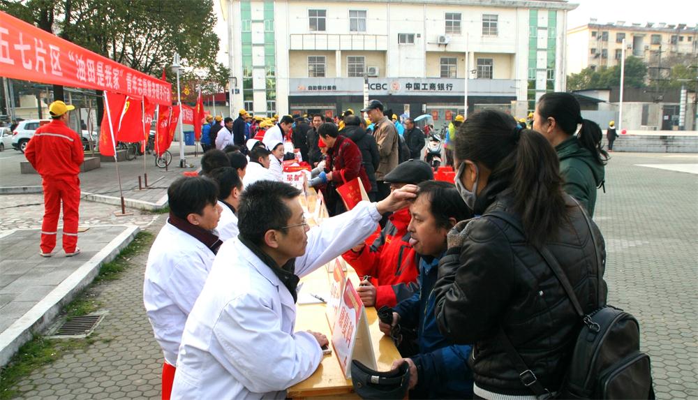 2017年元月21日上午,在五七钻南小广场,医院团委组织内一科、内二科、中医科、外一科、外二科、眼科、皮肤科、口腔科、康复科等科室的11名中青年专家,参加五七社区开展的“油田是我家”青年志愿者暖冬服务活动。