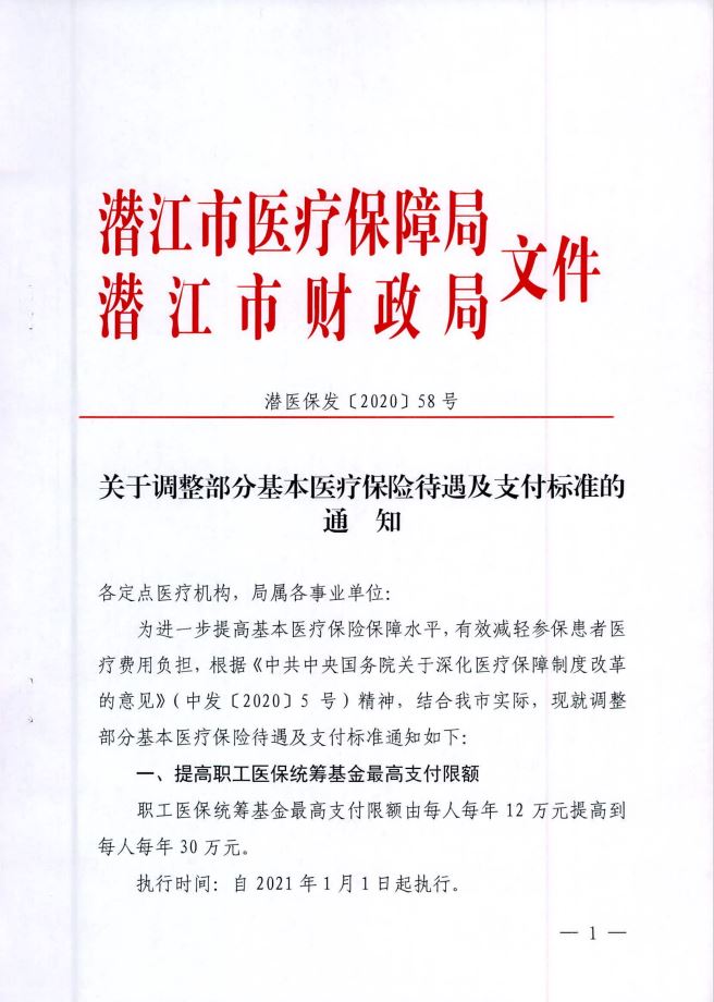 潜江市医保局《关于调整部分基本医疗保险待遇及支付标准的通知》