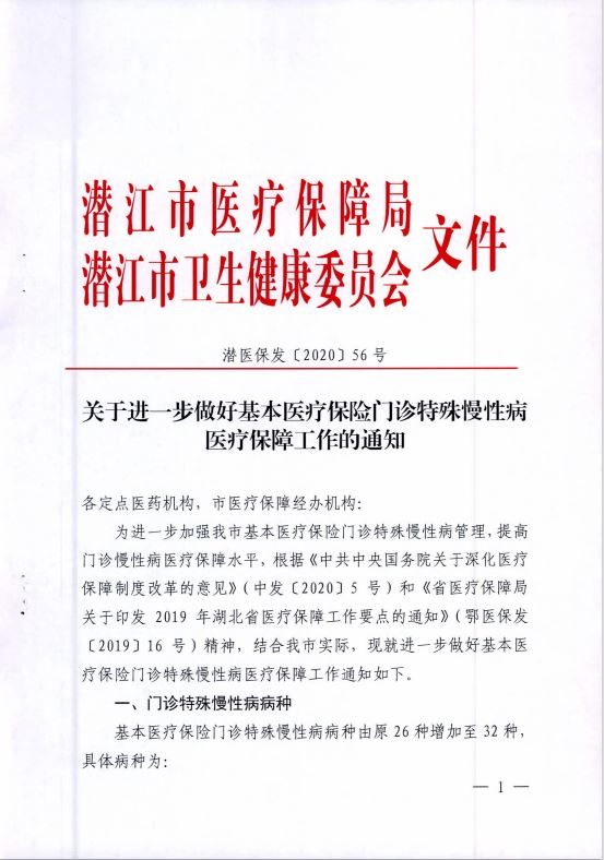 潜江市医保局《关于进一步做好基本医疗保险门诊特殊慢性病医疗保障工作的通知》