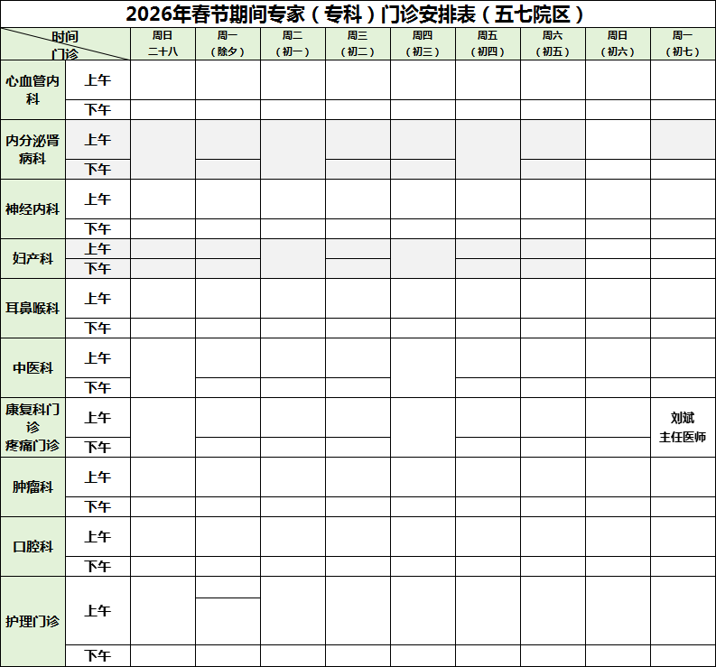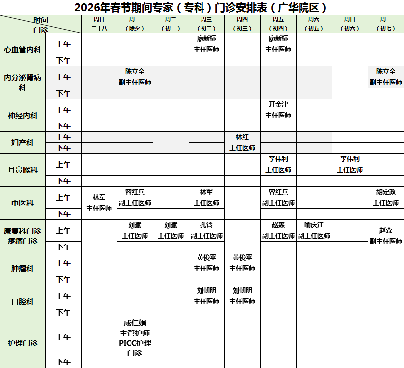 为方便患者安排就医时间,我院公布2026年2月15日-23日广华院区、五七院区专家(专科)门诊安排如下: