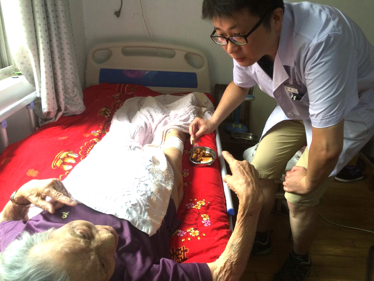 主治医师谷军还对患者实行医疗护理延伸服务,病人出院后多次上门亲自为患者换药和康复理疗。