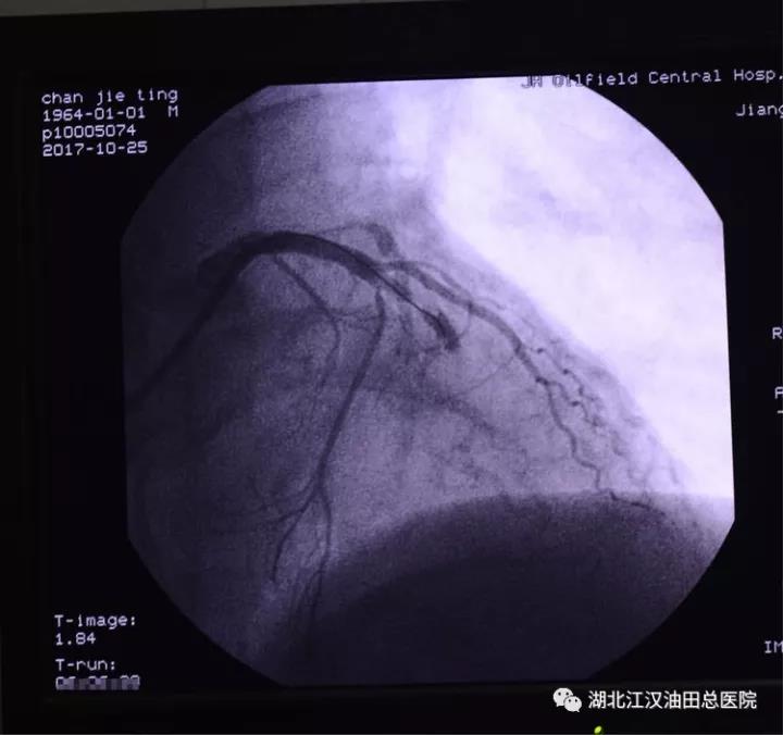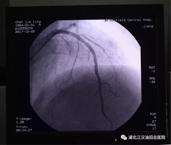 5:56分,心脏血管造影结束,诊断为左前降支血管闭塞。马上开通闭塞血管,植入支架。