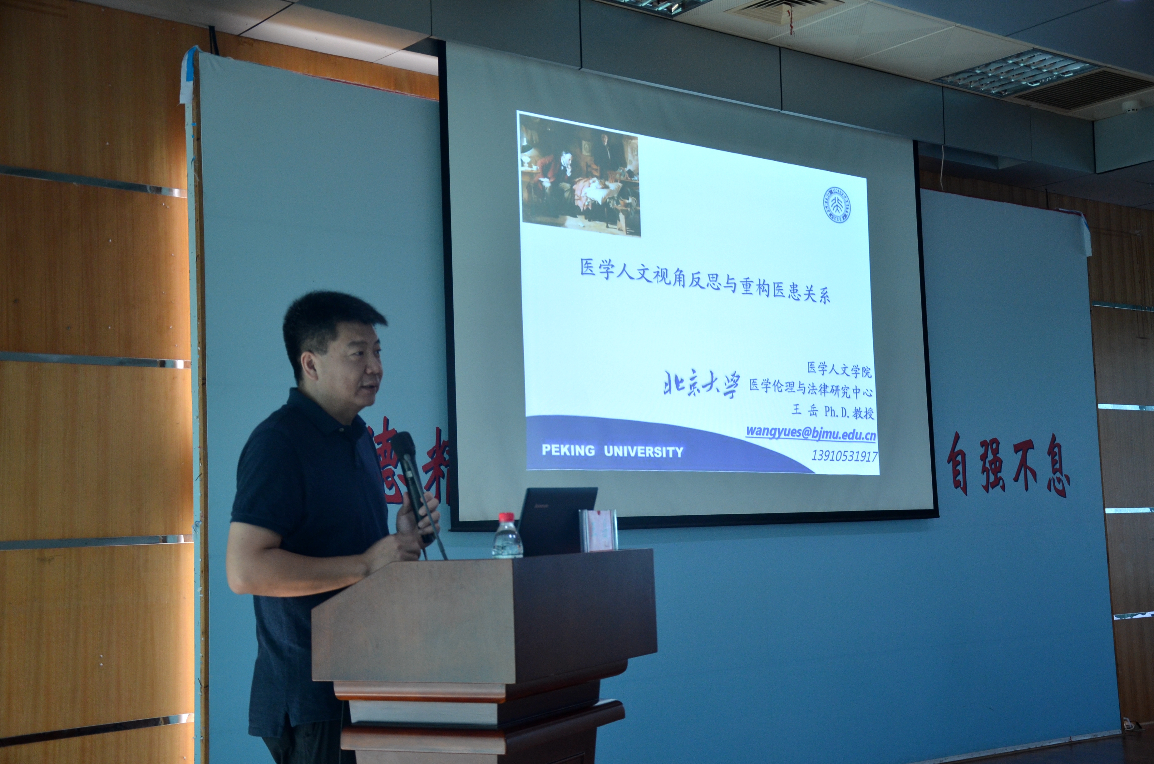 王岳教授讲解谈吐严谨,言语诙谐幽默,会场气氛活跃。他的精彩讲座赢得全场的阵阵掌声,他的讲座让在座的每一位听者受到一次很好的人文素质教育和深刻的思想启迪,将激发医务工作者对医学人文精神和职业信仰的思考。一位听者激动地告诉记者:“听完王岳教授的讲课,深刻体会到医学人文是一种心灵深处的共鸣,一种内心世界与人文精神趋同的价值碰撞,给予我以全新的视角和观念重新认识了医患关系和医患沟通,受益匪浅,对我今后的工作起到积极的指导作用。”