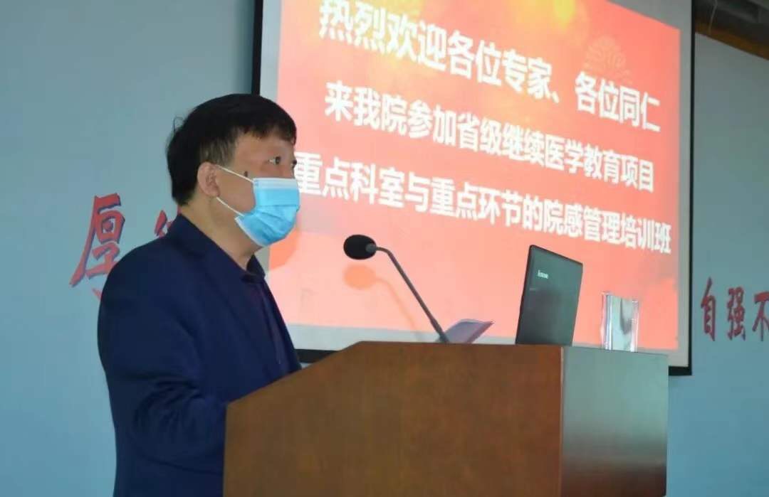 油田总医院副院长廖新标致辞。他首先对前来授课的专家表示热烈欢迎和衷心感谢;随后向专家和现场嘉宾介绍了油田总医院今年年初在新冠抗疫工作中取得的成绩,肯定了院感工作的重要性;最后,他对今后该院院感工作提出了精细化、素质化、专业化的要求。