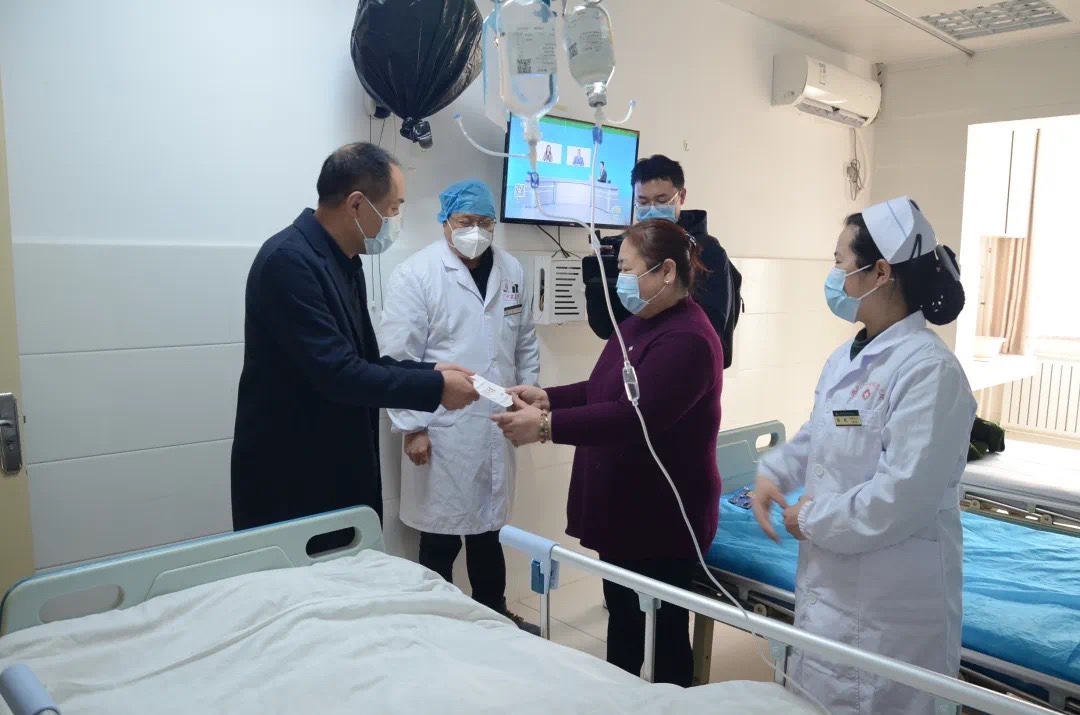 上午,总医院党委书记陶银保、院长邵士清、党委副书记、工会主席文佐娟、院工会副主席朱美跃和社工志愿者们一起,在基金社区监督员刘建军的见证下,来到肿瘤科、中医科、精神科,为患者送去了问候和救助基金。