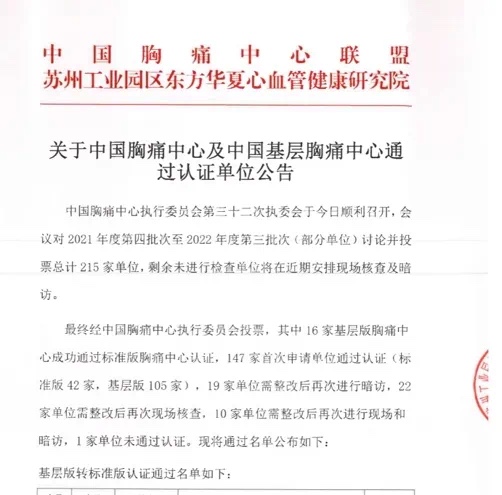 中国胸痛中心执行委员会第三十二次执委会于4月7日召开,会议对2021年度第四批次至2022年度第三批次215家单位进行讨论并认证,正规的网赌网站胸痛中心成功通过标准版胸痛中心认证。