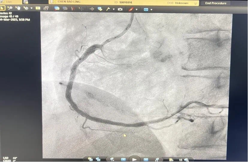 副主任何涛、医师熊俊锋、护士张梅梅顾不上休息,立刻投入到第三次抢救中。胸痛中心团队心内科与急诊科无缝衔接,23点26分在导管室开通堵塞血管,又成功救治一名急性心肌梗死患者。患者张某送至导管室施行急诊冠脉介入治疗,经过快速的术前准备,以mini Crush术式于回旋支远段植入波科冠脉支架一枚,再于钝缘支中段至回旋支中段植入Firebird2冠脉支架一枚。患者症状大幅缓解。零点42分手术结束,复查患者血压、心率正常后将患者送回病房。