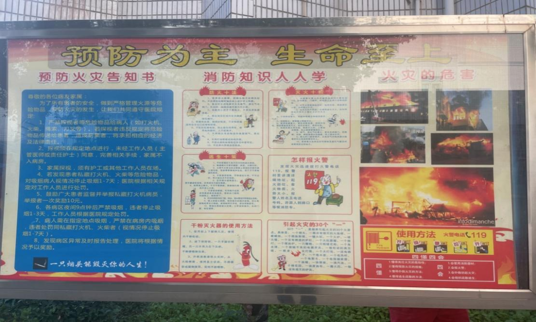 广华院区、五七院区、基层卫生院所利用电子屏、视频、宣传栏等多种形式播放消防安全知识和火灾事故案例,通过实例让员工和患者深刻认识到火灾的危害性和预防措施的重要性,提醒员工和患者关注火灾防范和逃生自救知识。