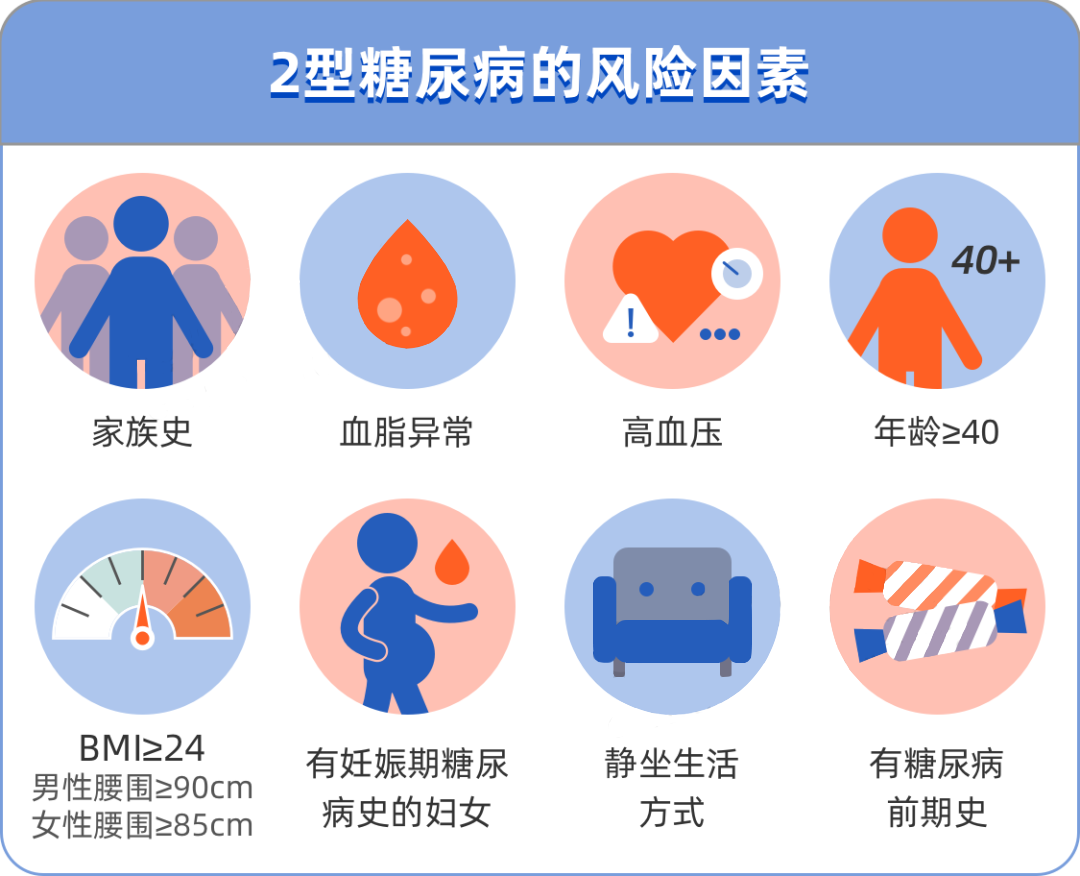 5.体重:超重(BMI≥24kg/㎡ )或肥胖(BMI≥28kg/㎡ )或中心型肥胖(男性腰围≥90cm,女性腰围≥85cm)会增加患2型糖尿病的风险。
