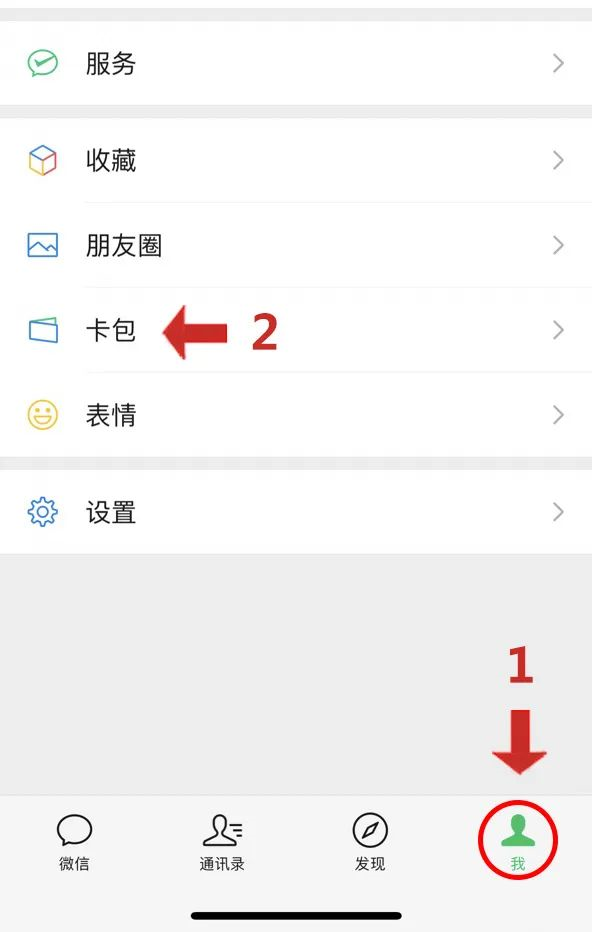 第一、二步:打开微信 APP, 点击右下方的“我”,点击“卡包”